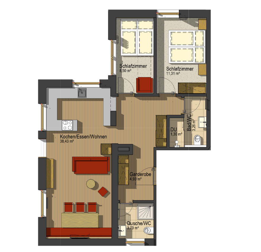 2 Schlafzimmer mit Doppelbett (Doppelbett kann getrennt werden)