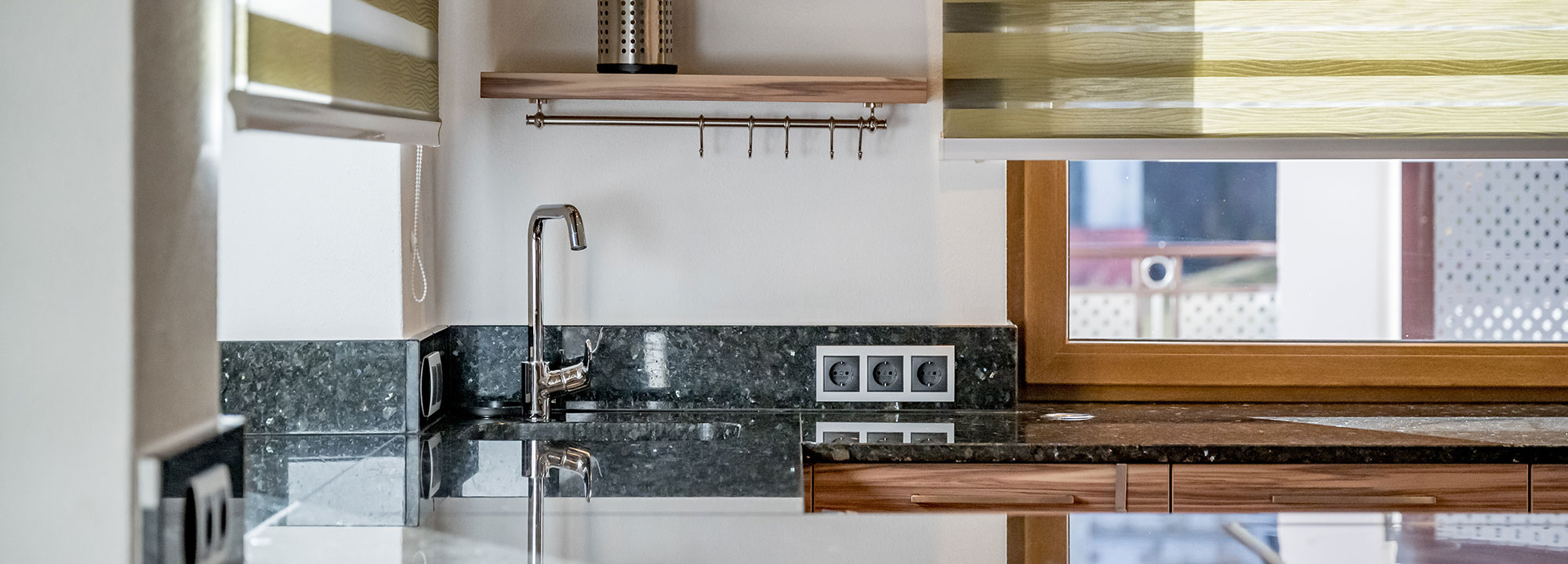 Küchenzeile ausgestattet mit Geschirr- und Kochausstattung, Spülmaschine, Mikrowelle, Kühlschrank, Pad-Kaffeemaschine , Herd mit Induktionsplatte, Wasserkocher,, Airfryer, Hand- und Geschirrtücher, ( kein Backofen)
