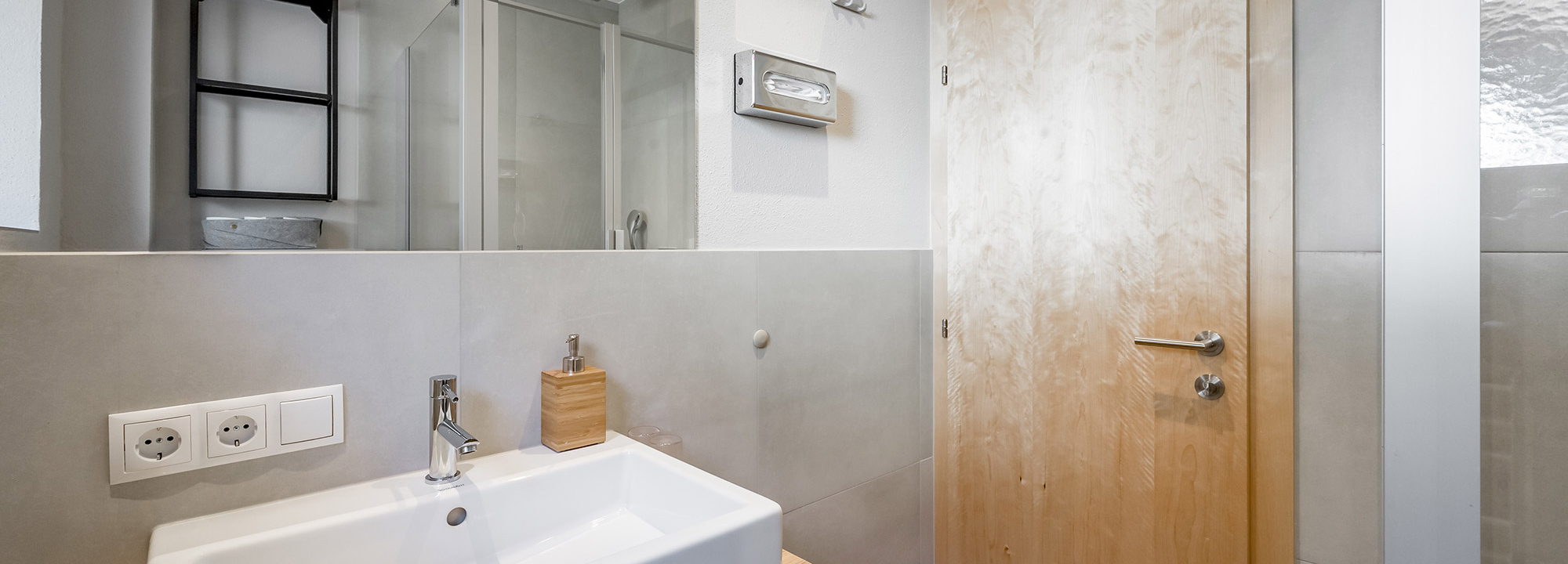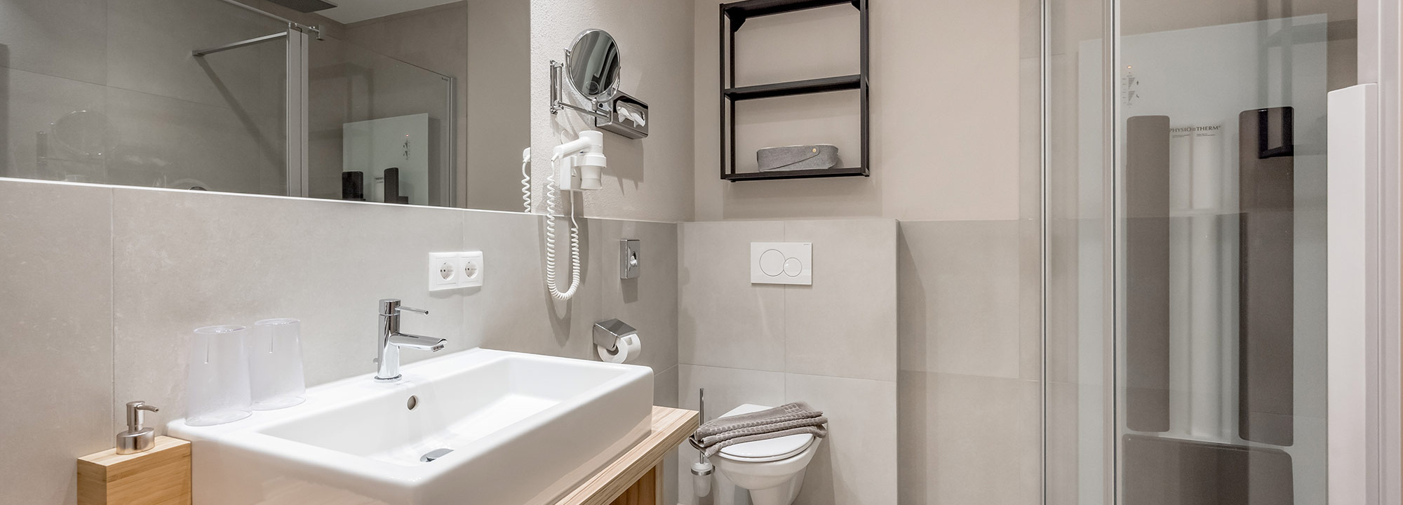 1 Badezimmer mit Regendusche, Private-Spa-Infrarotelement in der Dusche, Waschtisch, Fön und Kosmetikartikel