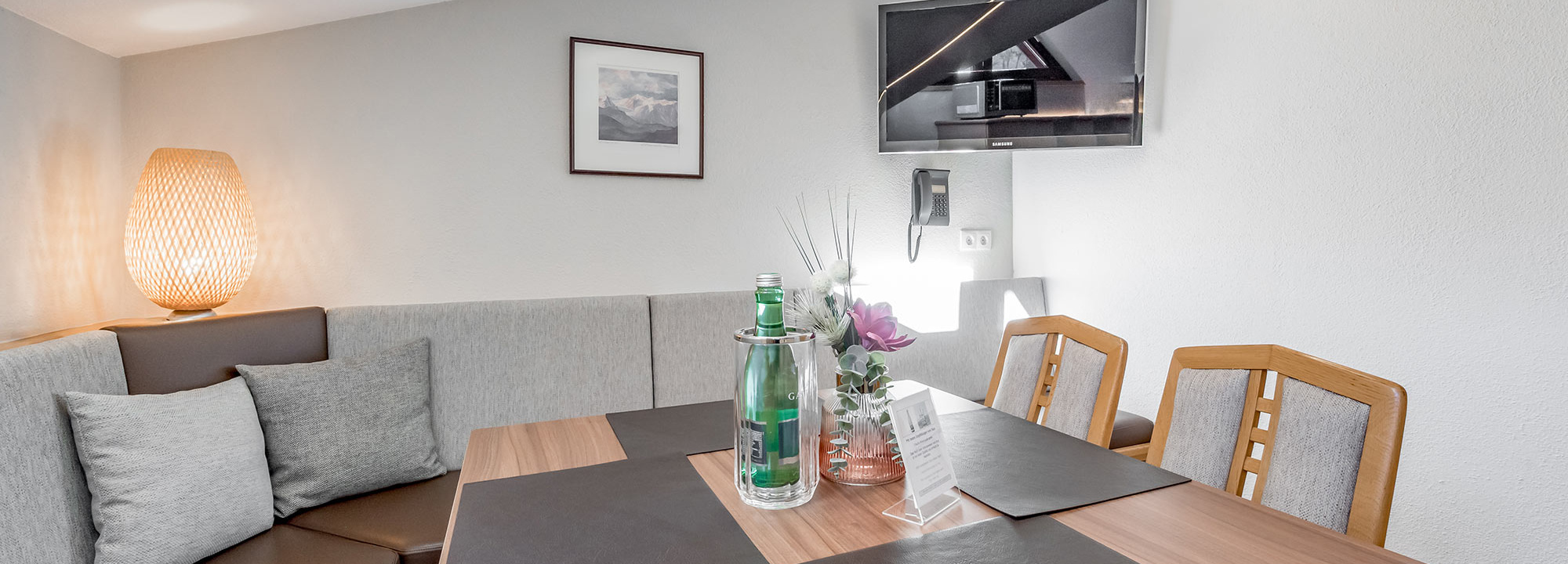 Küche mit Essecke und vollausgestatteter Küchenzeile