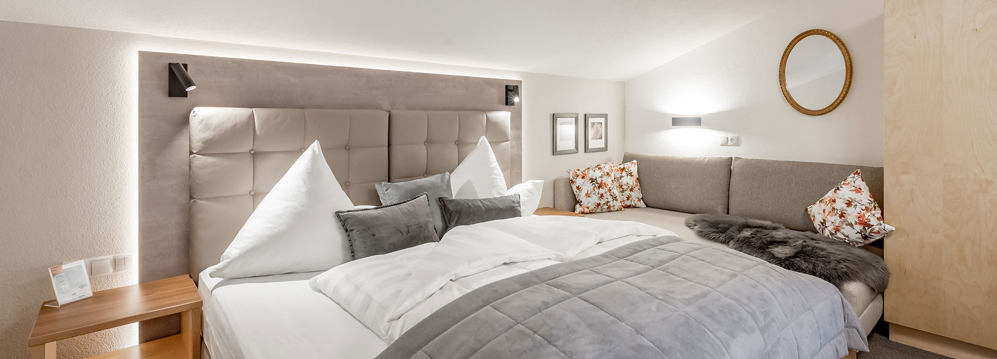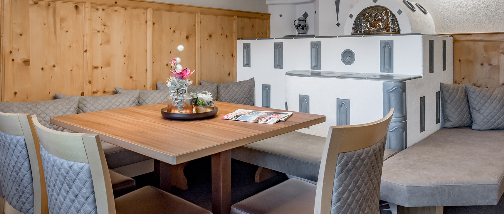 Wohnzimmer mit Doppelbett (auch zum trennen) 1 zusätzliche Couch, Kachelofen und Sitzecke