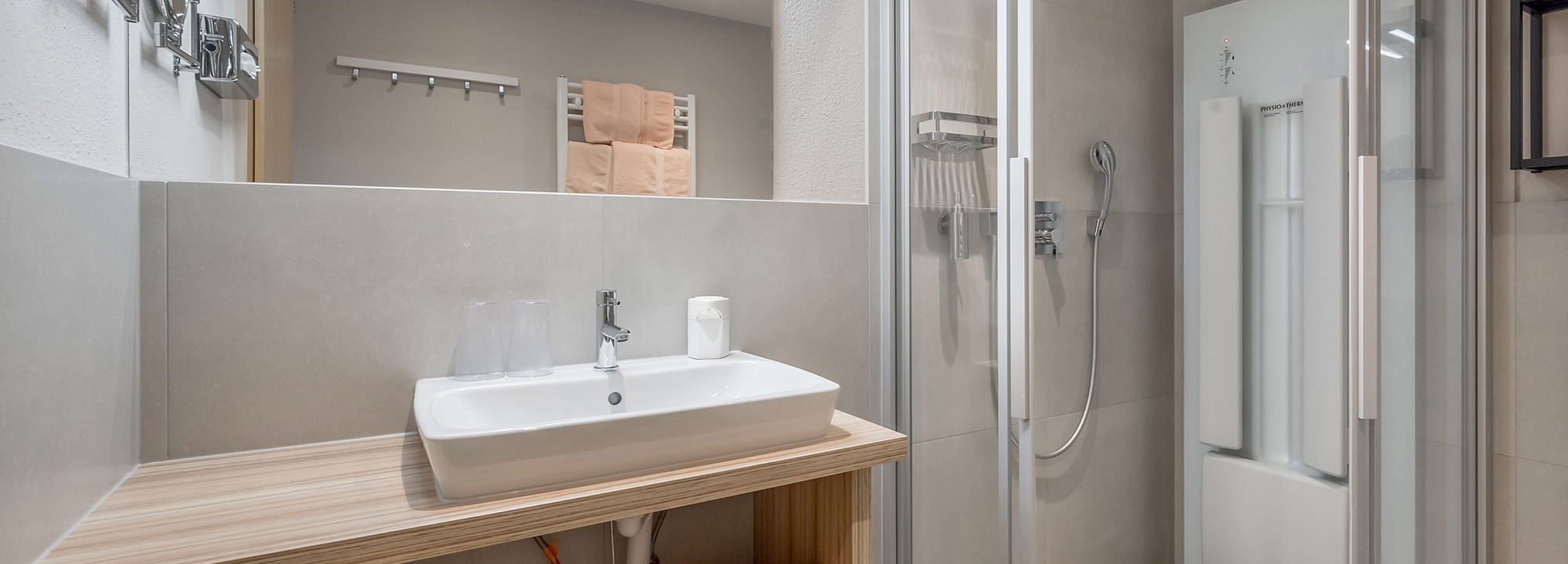 1 Badezimmer mit Regendusche, WC, Private-Spa-Infrarotelement in der Dusche, Waschtisch, Fön und Kosmetikartikel