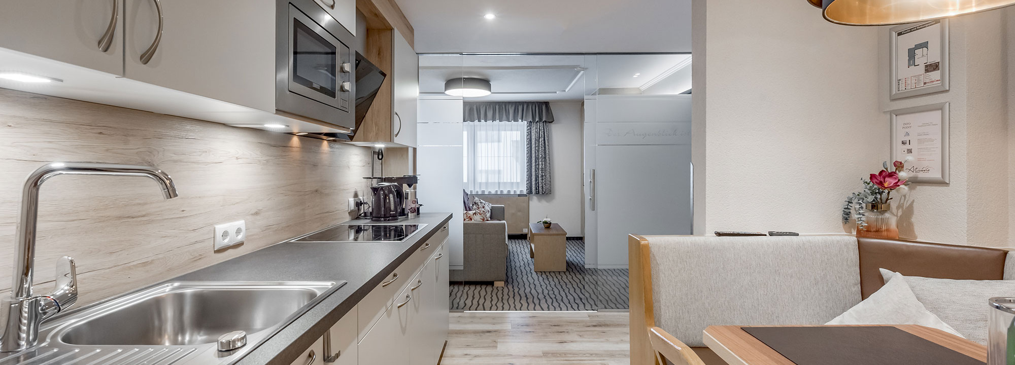 Wohnküche mit Ausziehcouch (Schlafmöglichkeit für 1 Person), vollausgestatteter Küchenzeile und Essecke.Dieser Raum ist durch eine Glastrennwand mit Schiebetür vom Schlafbereich getrennt.