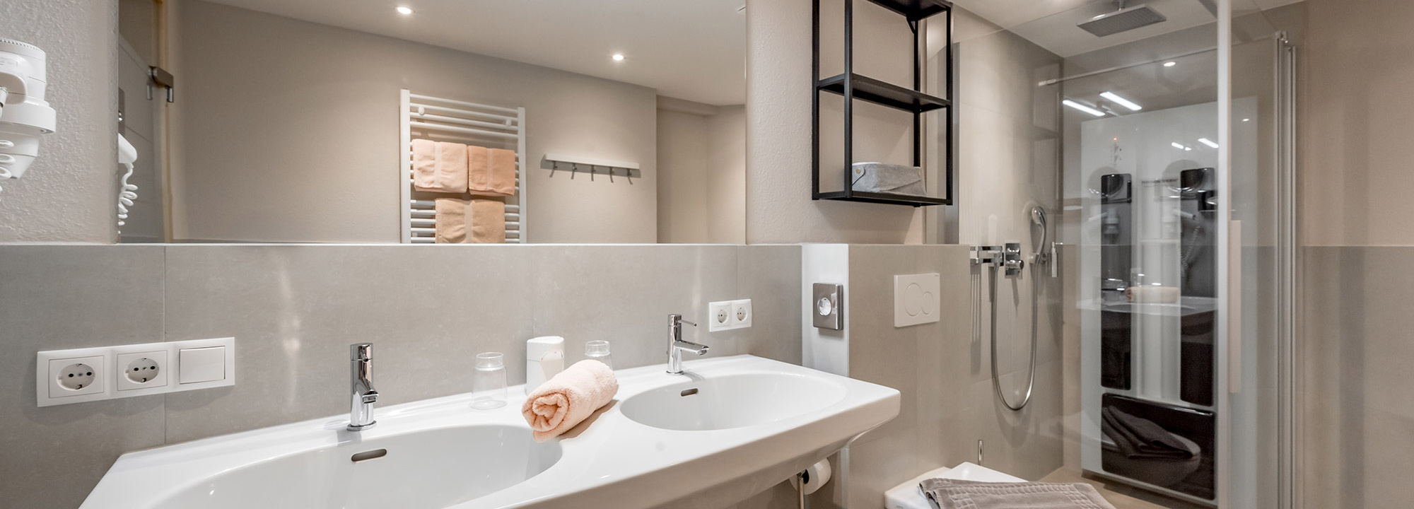 1 Badezimmer mit Regendusche, WC, Private-Spa-Infrarotelement in der Dusche, Waschtisch, Fön und Kosmetikartikel